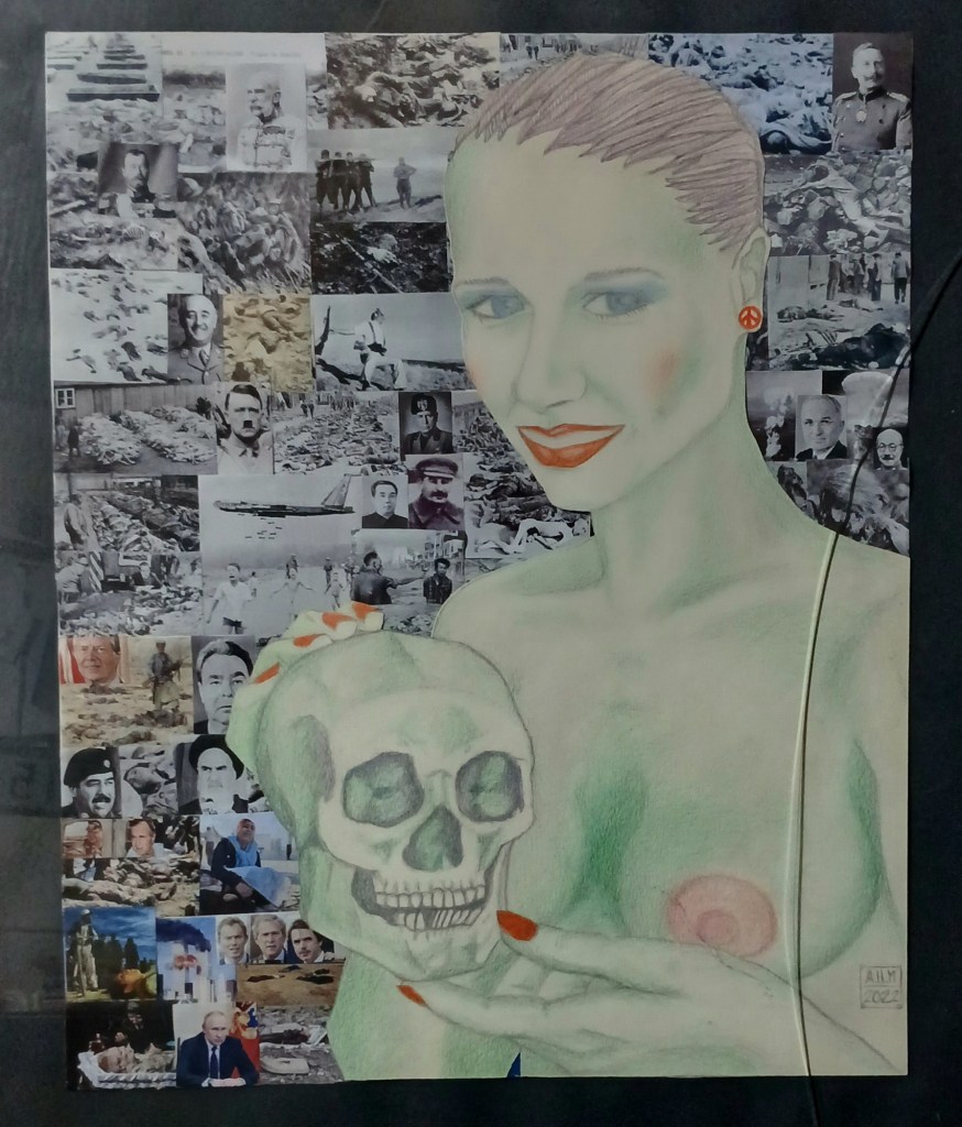 Siguiendo esa línea, el viejo mito de Afrodita y Ares, se sintetiza en el collage: donde Ares ha quedado relegado a la representación de los macabros machismos que en el S.XX produjeron los mayores horrores de la historia; mientras que Afrodita aparece como garante de la recuperación del mejor concepto posible de humanidad. Es una visión subjetiva, pero los hechos son los que son y se pueden constatar.